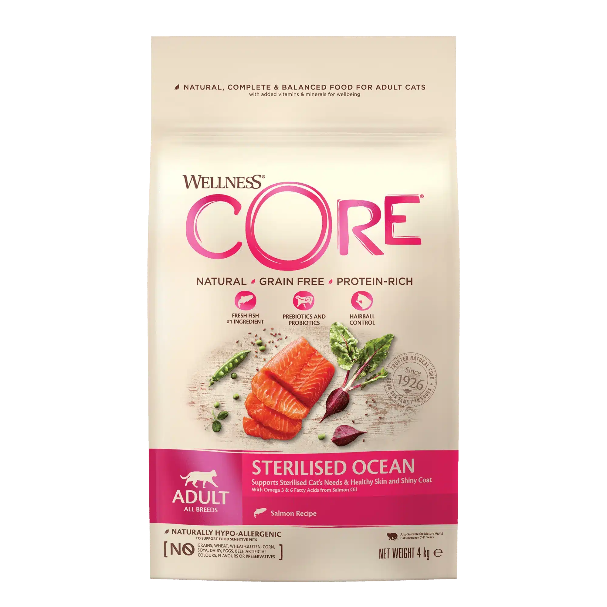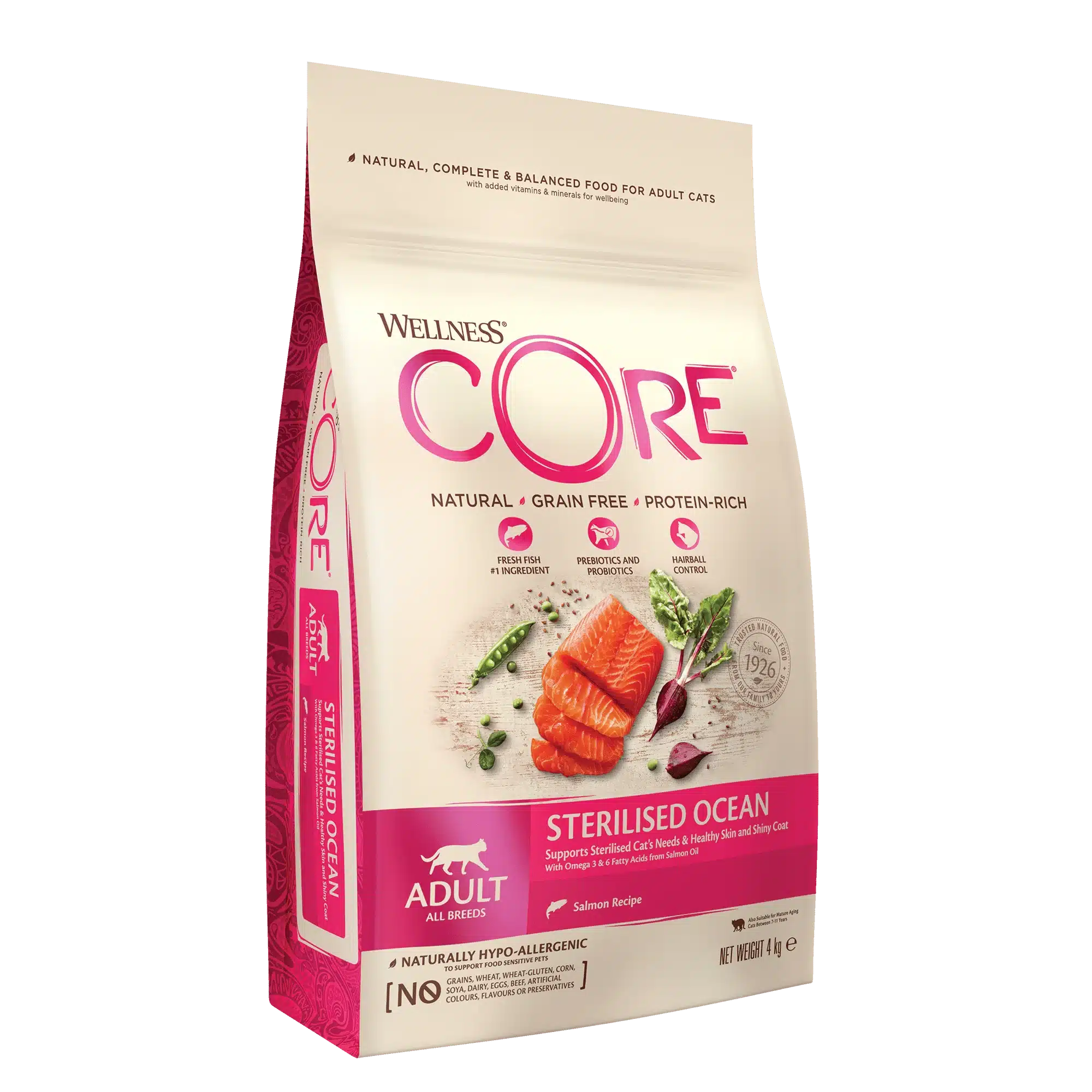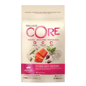 Après la stérilisation, les besoins nutritionnels du chat évoluent : baisse de l’activité physique, ralentissement du métabolisme, prise de poids plus facile. La recette Wellness CORE Sterilised Ocean – Saumon répond précisément à ces enjeux, avec une formulation à base de poisson comme unique protéine animale, et un apport calorique réduit de 30 % par rapport à la gamme CORE Original.