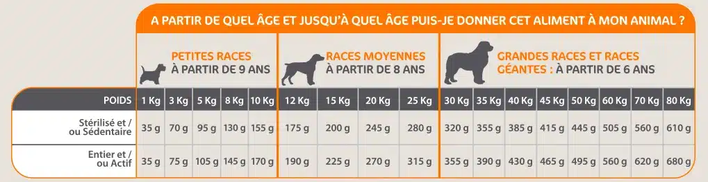 Les rations sont à ajuster selon l’activité, la température ambiante, le tempérament ou la condition physique de l’animal. Grâce à une densité énergétique élevée, de petites quantités suffisent à couvrir les besoins du chien senior, tout en respectant son estomac.