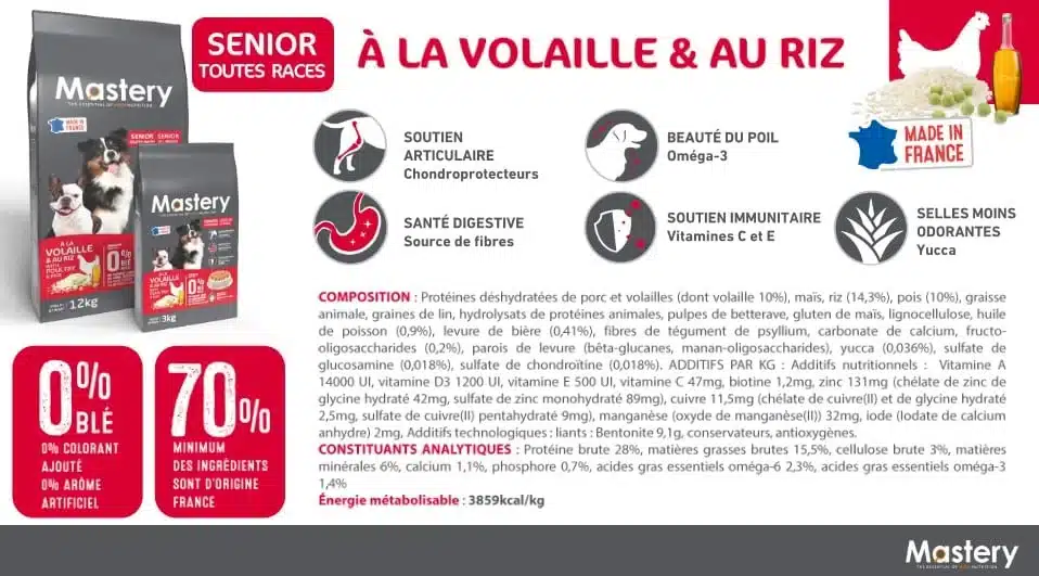 Les croquettes Mastery Chien Senior offrent un parfait équilibre entre protéines hautement digestibles, graisses de qualité, et fibres fonctionnelles pour aider ton chien à conserver une bonne masse musculaire, tout en ménageant son système digestif, ses reins et son cœur.