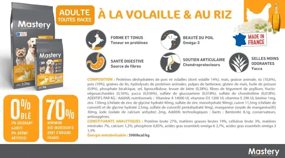 Les croquettes Mastery Chien Stérilisé Volaille sont conçues pour accompagner les chiens adultes ayant été stérilisés ou sujets à la prise de poids. Cette formulation complète et digeste contribue à maintenir la forme physique du chien tout en assurant une excellente assimilation des nutriments.