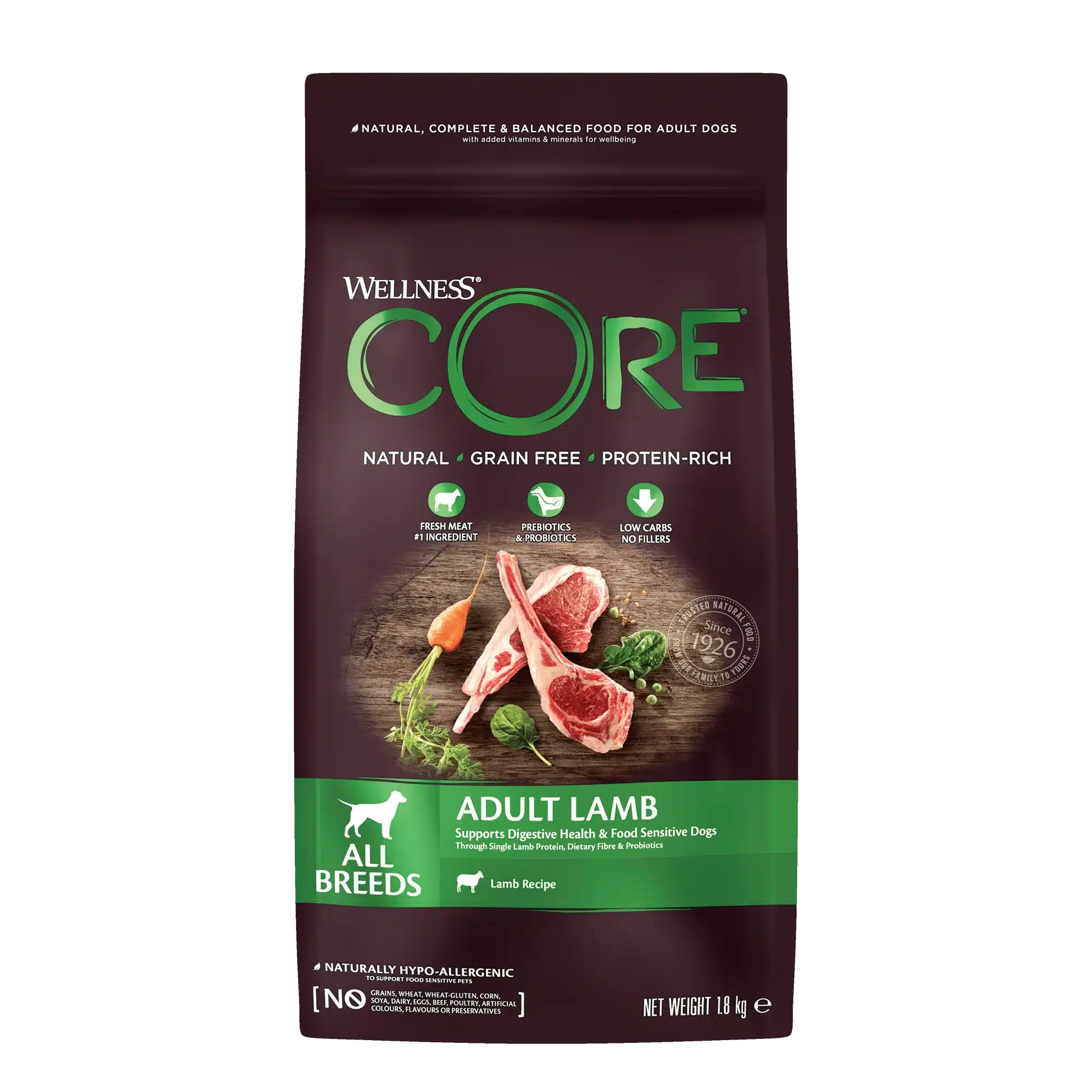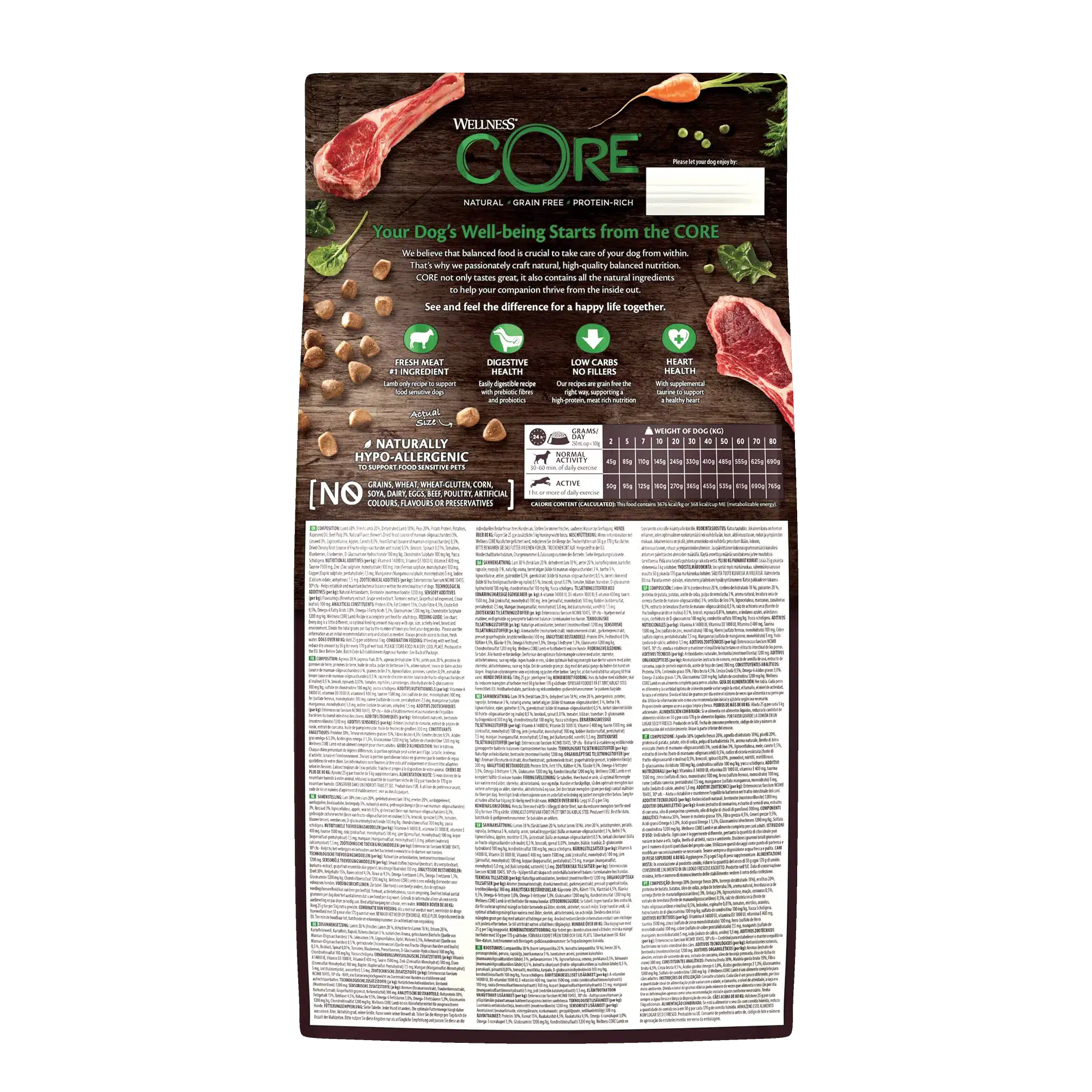 Certains chiens adultes développent des intolérances ou sensibilités digestives liées aux protéines les plus courantes comme le bœuf ou le poulet. La recette Wellness CORE Adult Lamb – Agneau a été conçue spécifiquement pour leur offrir une alternative mono-protéique animale, hautement digeste et riche en nutriments essentiels.