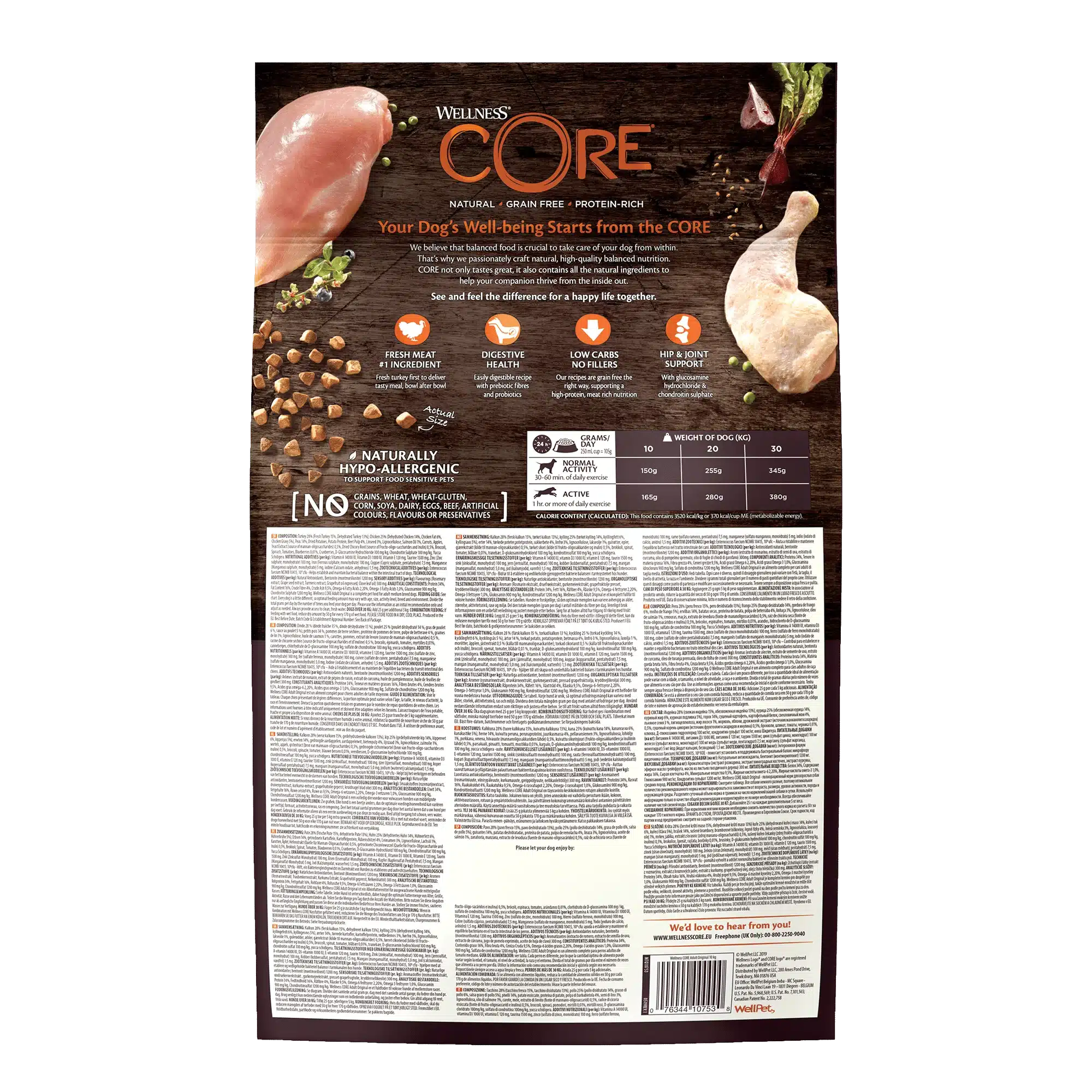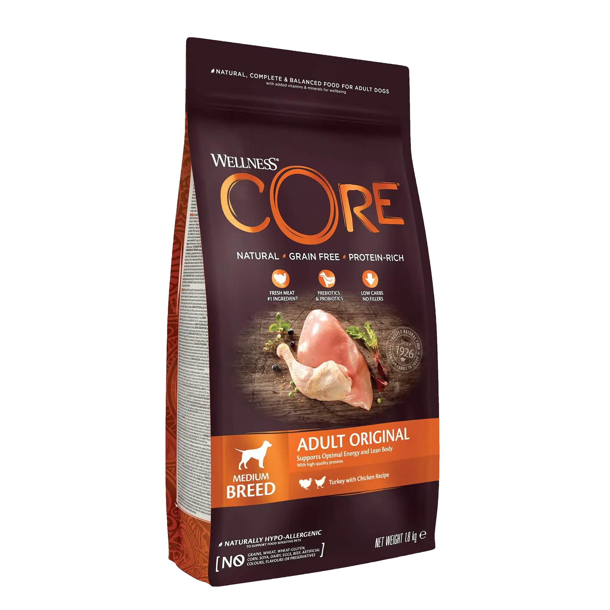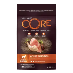 Les chiens adultes ont besoin d’une alimentation équilibrée, riche en protéines animales, et dépourvue d’éléments superflus pour rester actifs et en pleine forme. La recette Wellness CORE Adult Original – Dinde & Poulet répond à ces critères avec une teneur élevée en viande fraîche, une formulation sans céréales, et un profil nutritionnel adapté au maintien d’un corps athlétique et d’un métabolisme stable.